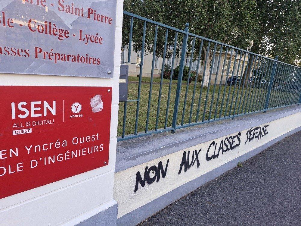 Sur une autre inscription, on peut lire « Non aux classes défense », en référence à ces classes menant un projet pédagogique en lien avec la défense et la sécurité, et donc les militaires.