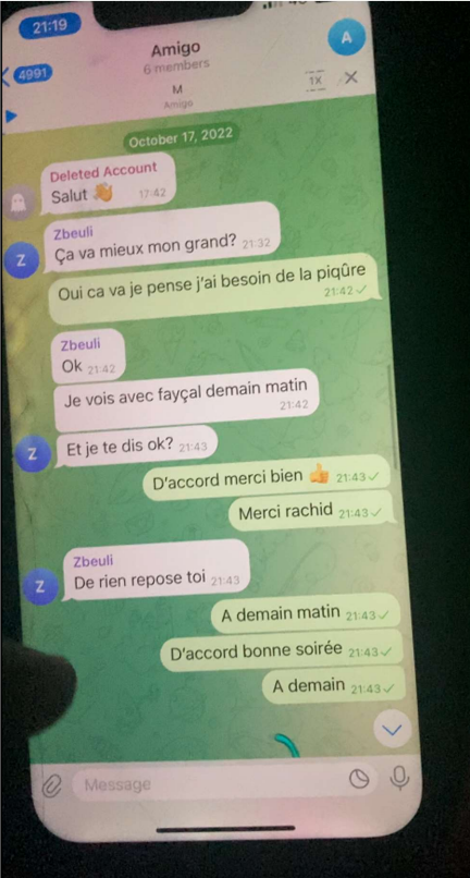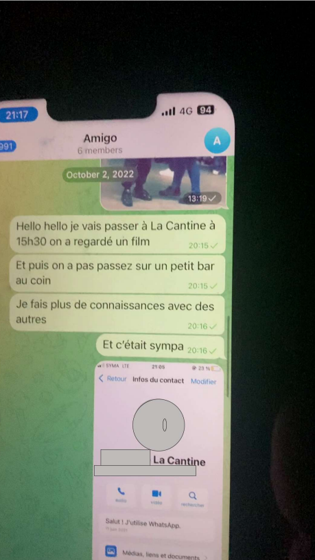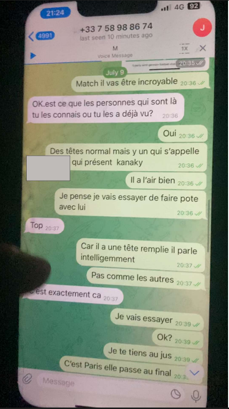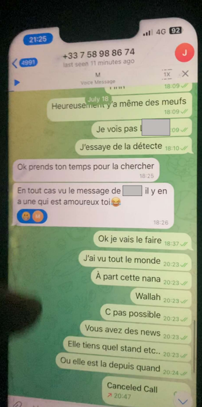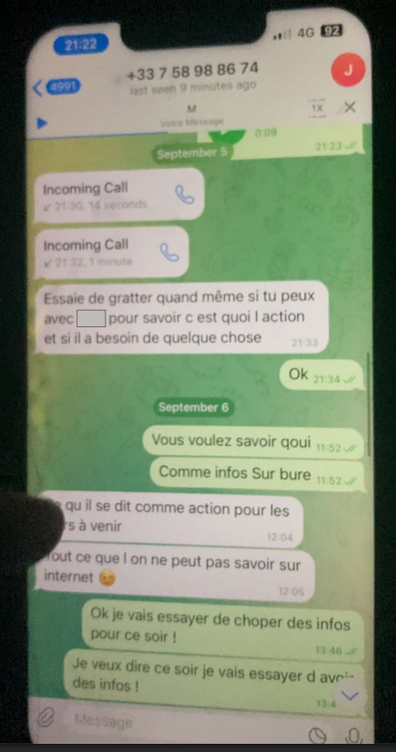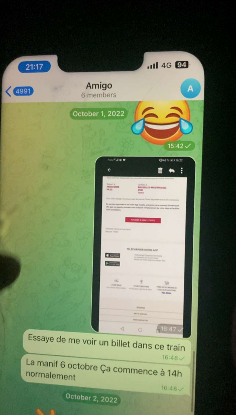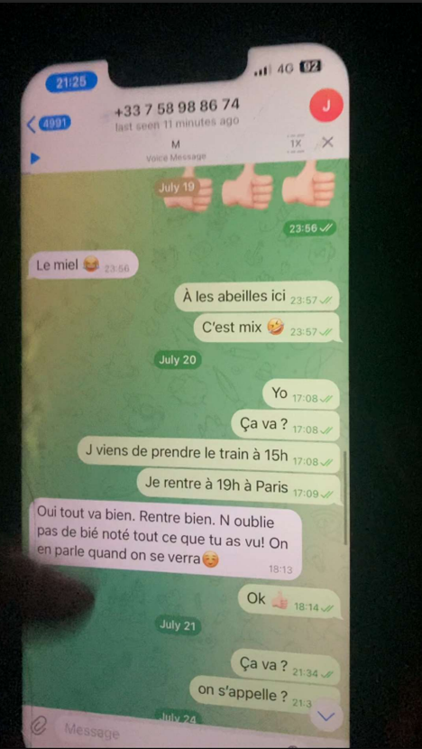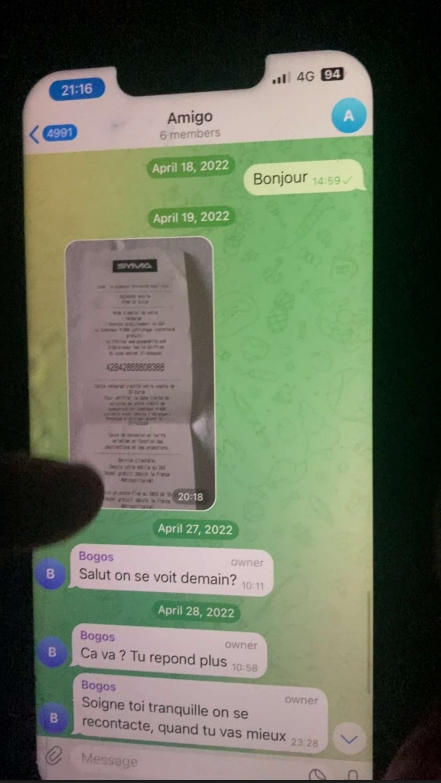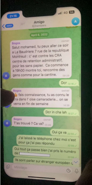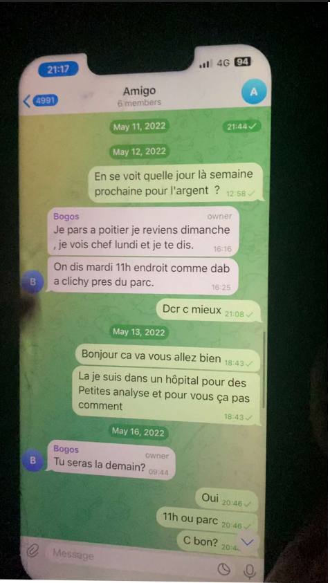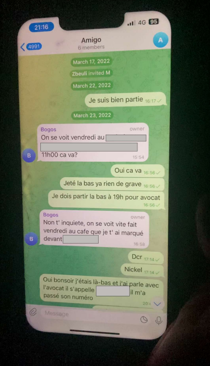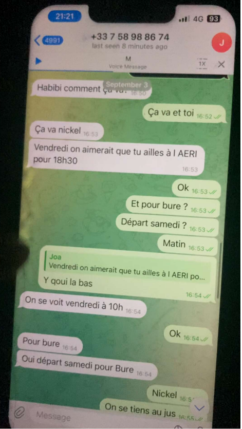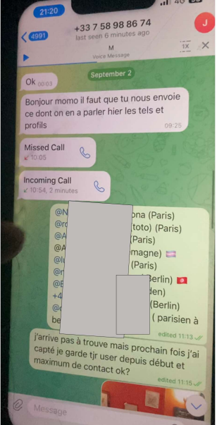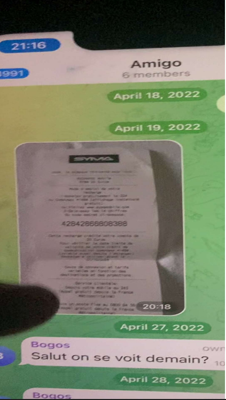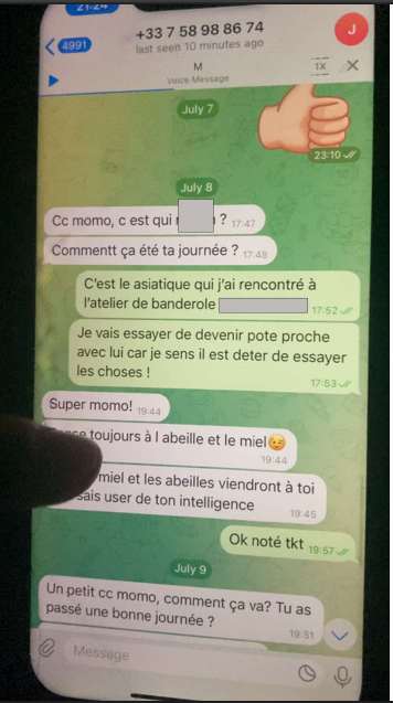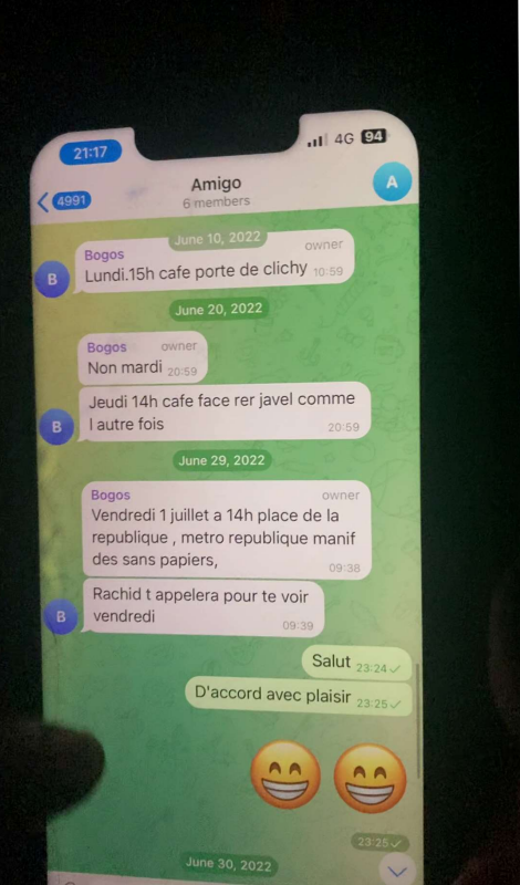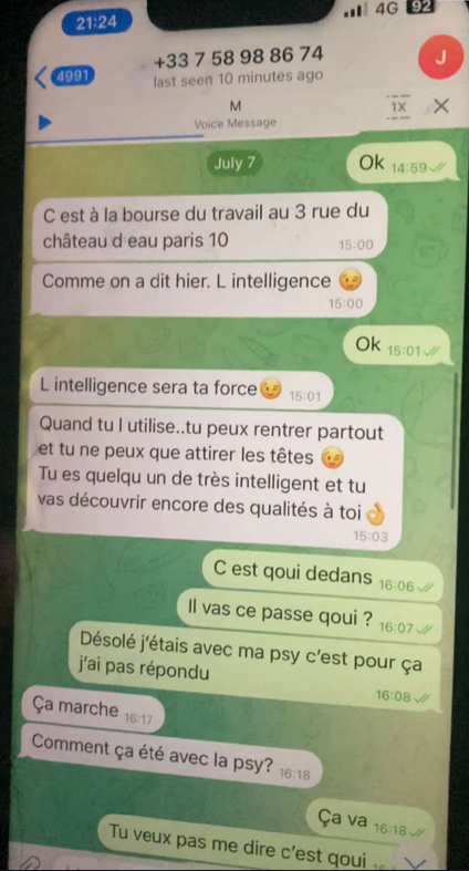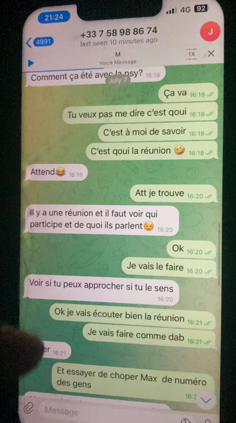 D’après ses dires, il aurait commencé à bosser avec la police suite à une interpellation. Les flics lui auraient montré des vidéos de lui en train de faire de la casse. Ils ont menacé de le “faire tomber” avec pour conséquences qu’il finisse en prison/CRA car il n’avait pas de papiers français. Ils lui auraient promis un titre de séjour en l’échange de ses renseignements et par la suite lui ont fait miroiter un renouvellement de ce titre de séjour entre 2 et 5 ans. Nous avons constaté que les flics payaient en cash ses billets de train, son loyer (au moins partiellement), son école, ses médicaments etc. Dans les conversations, il était proche avec les flics (surtout en 2025), témoignant d’un vrai lien émotionnel avec eux qu’ils entretenaient en exploitant son isolement et sa situation. On sait qu’ils parlaient principalement sur Telegram mais aussi sur signal, whatsapp…
