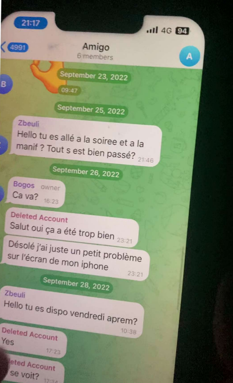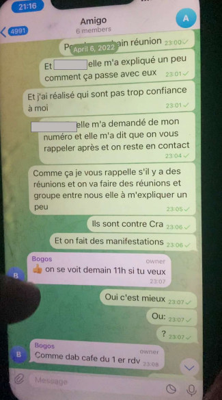 La conversation principale s’appelle « Amigo » et est composée de 5 flics et lui. Ils parlaient aussi individuellement avec eux en privé. La majorité des requêtes en ligne passait dans ces canaux. Mais l’essentiel des informations était donné lors de rendez-vous dans des cafés et des lieux publics disséminés dans Paris ou sa proche banlieue (surtout nord ouest). Les rendez-vous étaient parfois très rapprochés dans le temps : cela pouvait aller de toutes les deux semaines sur certaines périodes et jusqu’à tous les 2-4 jours en moyenne en 2025. Leurs rendez-vous se passaient aussi avant et après des actions concrètes. Il aurait été très actif autour de Bure sur ces 6 derniers mois. Le gros du renseignement se passait sûrement lors des rendez-vous et il y a donc beaucoup d’informations qu’il a pu transmettre dont nous n’aurons jamais connaissance.