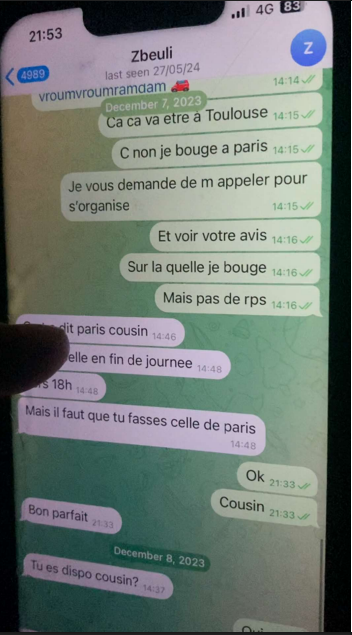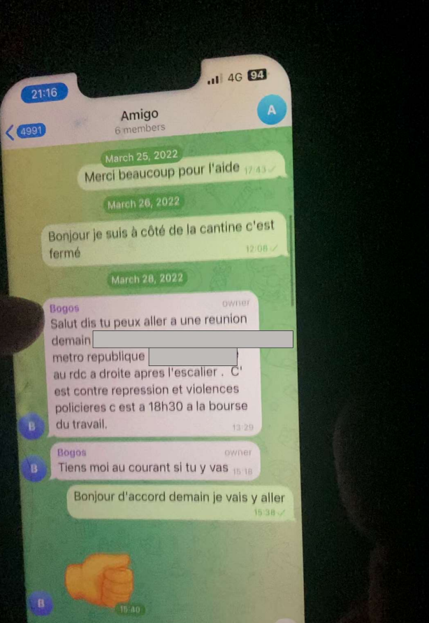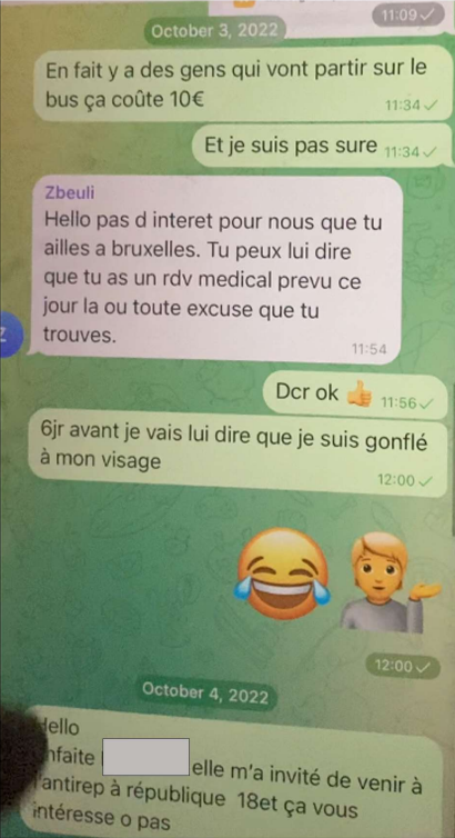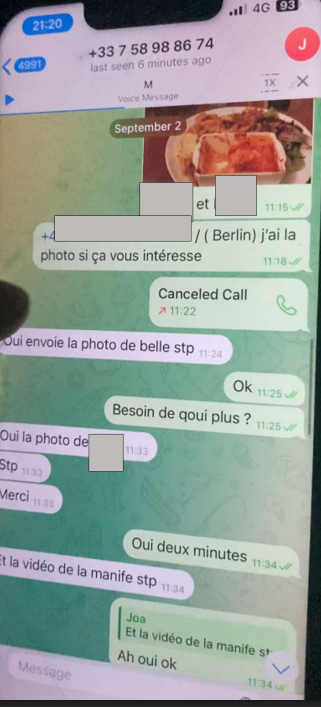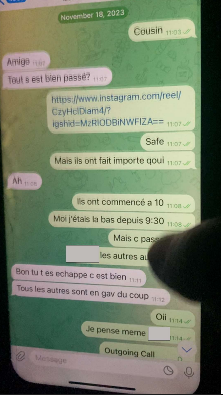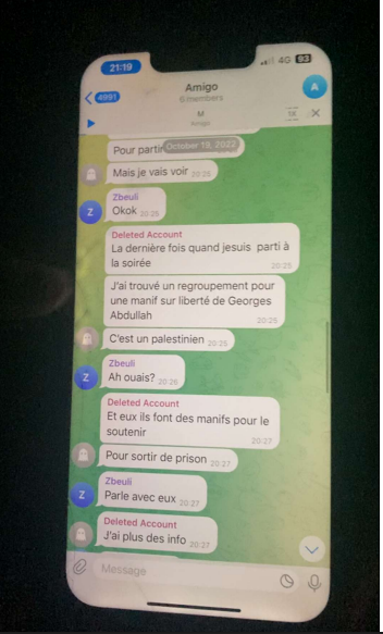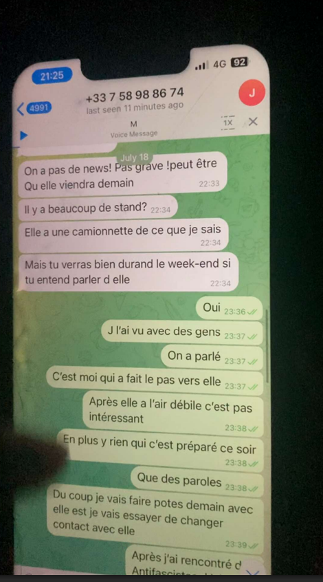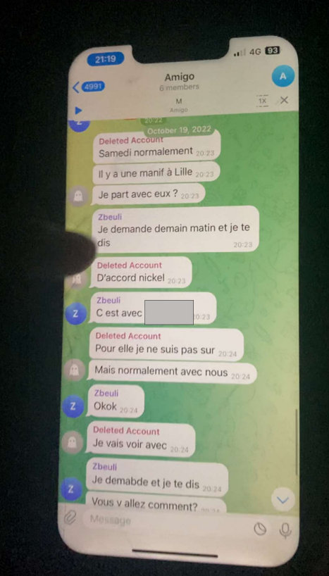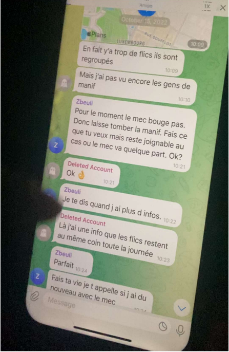 La conversation a été effacée sur toute la période novembre 2022 – novembre 2023: il est donc impossible de savoir si des renseignements ont été fournis sur la période du mouvement social contre la réforme des retraites de 2023. Mais il était particulièrement actif dans le bloc parisien et aurait aussi participé à au moins ces espaces : festival des luttes paysannes autour de Bure d’août 2023, Sainte-Soline week-end 2 et la semaine d’action contre Lafarge de décembre 2023 à Paris organisée par le soulèvements de la terre.