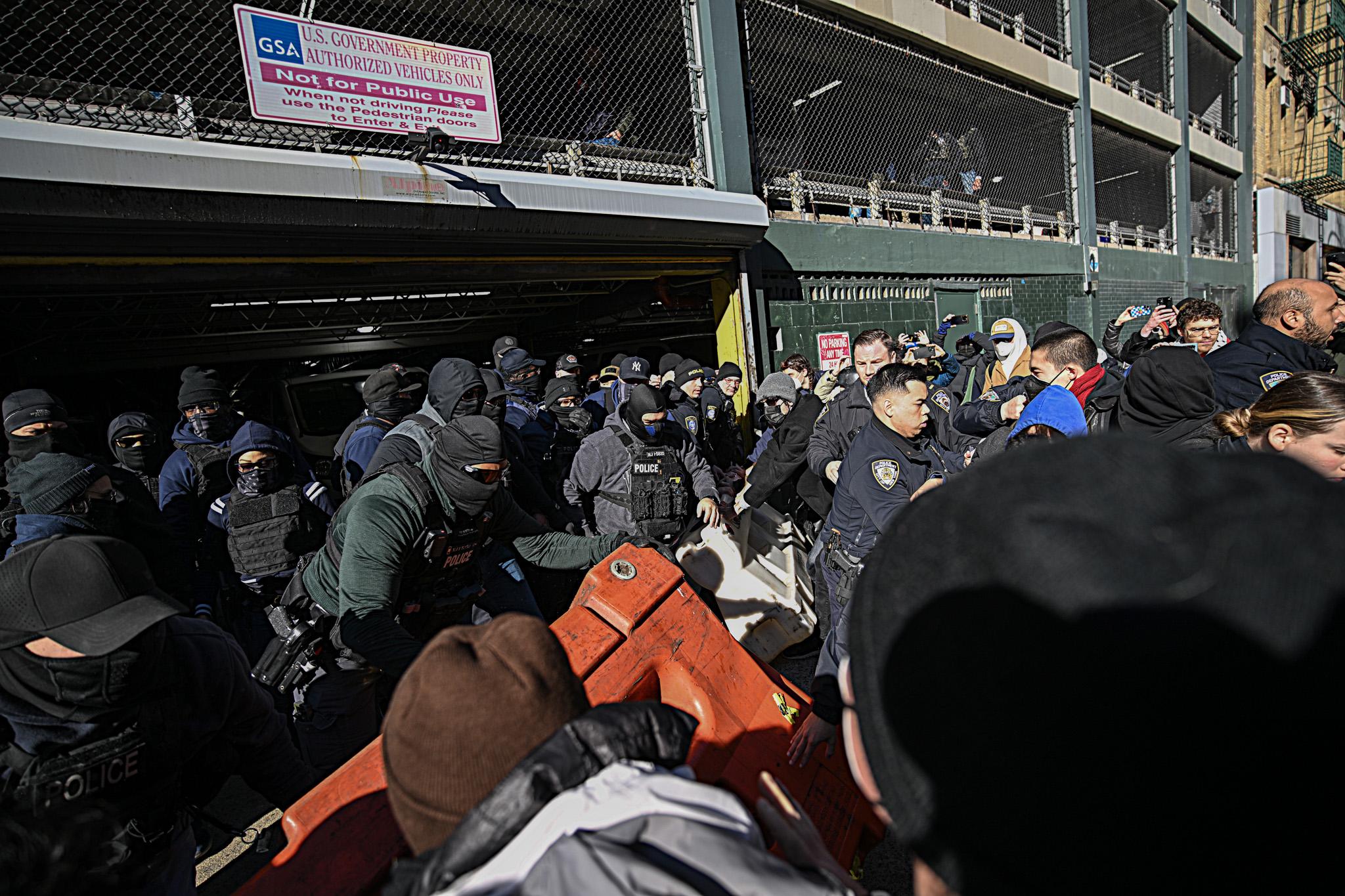 Ce siège a duré plusieurs heures, avec les agents de l’ICE piégés à l’intérieur du garage de 10h jusqu’en début d’après-midi. Pendant ce temps, le NYPD a fait plusieurs interpellations, mais s’est principalement concentré sur l’installation de ses grillages antiémeute, pour diviser la foule en deux ou trois groupes et préparer la route pour le passage du convoi des fédéraux. Au fil du temps, il est devenu clair que si l’ICE tentait une rafle près de Lower Manhattan ou Chinatown, ces foules l’auraient suivi.