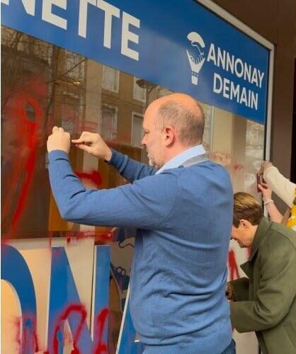 Ce samedi 31 janvier, en matinée, Marc-Antoine Quenette (LR), candidat aux élections municipales à Annonay, a découvert son local de campagne tagué au 11, rue Sadi-Carnot. Sur la vitrine, en lettres rouge sang, on peut lire : « Quenette No pasaran RN ».