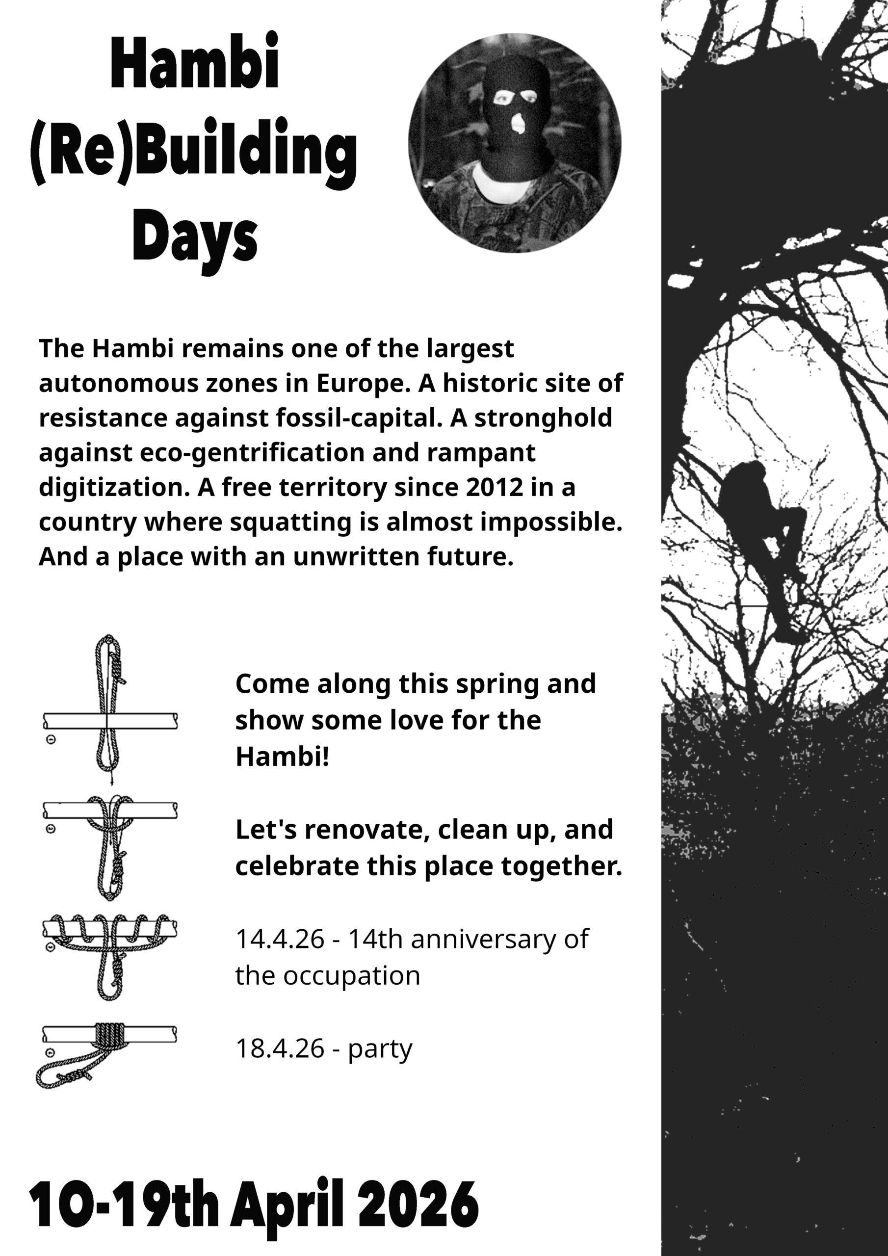 “Hambi” a été un point de concentration pour les luttes anti-capitalistes et ecologistes radicales en europe. La zone autonome créée ici est comparable en taille à la ZAD de Notre-Dame-des-Landes et à Exarcheia à Athènes. Hambi a aussi servi de prédecesseur clé pour beaucoup d’autres luttes de territoires rien qu’en Allemagne, comme Lützerath et le bois de Dannenröder qui sont les deux exemples les plus connus.