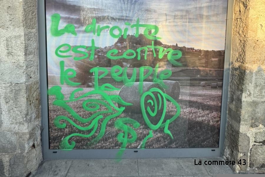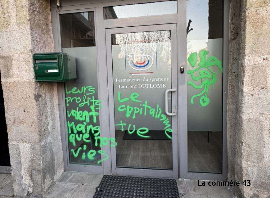 Dans la nuit de mercredi à jeudi, la permanence du sénateur Laurent Duplomb (Les Républicains) a été taguée au Puy-en-Velay à l’aide de peinture verte.